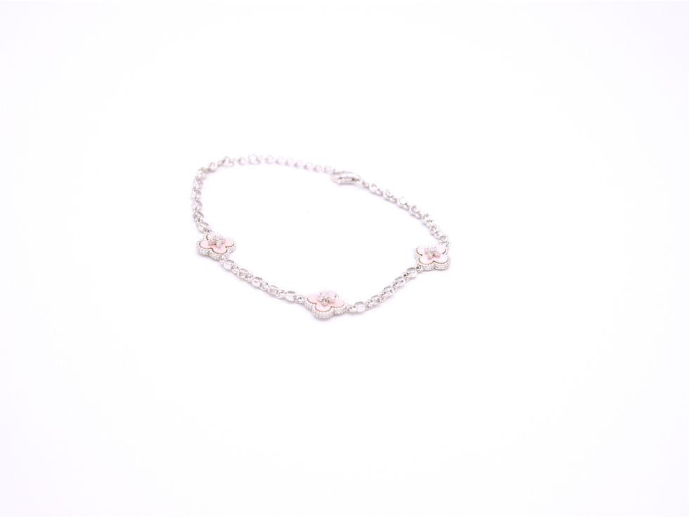 This elegant bracelet features a delicate chain adorned with dainty flower charms. Each flower is crafted with beautiful pink enamel, adding a touch of femininity and charm. The timeless design and high-quality materials make this bracelet a perfect addition to any jewelry collection.